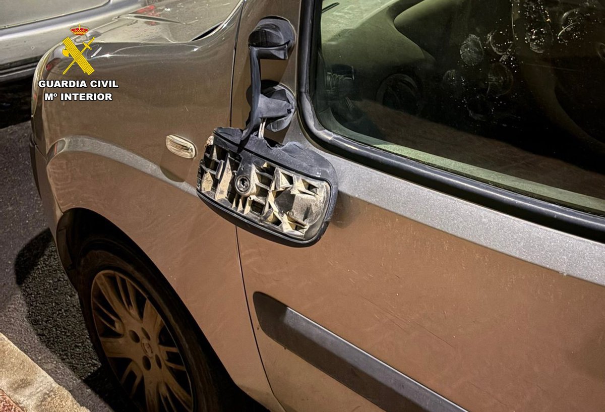 DAÑOS INTENCIONADOS EN NUEVE VEHÍCULOS La inspección ocular realizada en los nueve vehículos permitió comprobar que los daños ocasionados e intencionados en los espejos retrovisores presentaban signos evidentes de haber sido fracturados tras una patada, dejándolos inservibles.