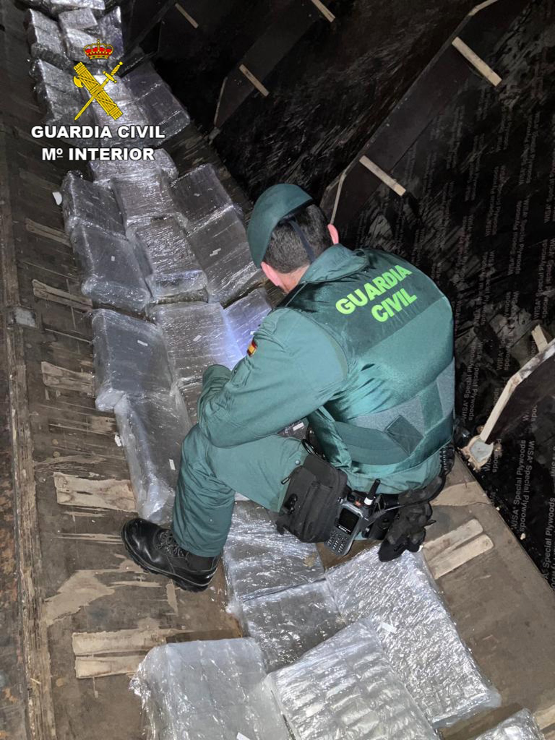 Ante estos indicios se levantaron las láminas, localizando tres dobles fondos donde se encontraban alojados 53 paquetes de grandes dimensiones que contenían tabletas de hachís.