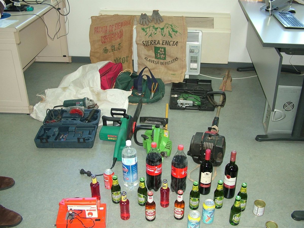 Los efectos intervenidos han sido una máquina de coser, unos alicates, dos motosierras, una radial, una desbrozadora, una caladora, unos guantes de goma, 20 litros de bebidas y dos botes de pintura.