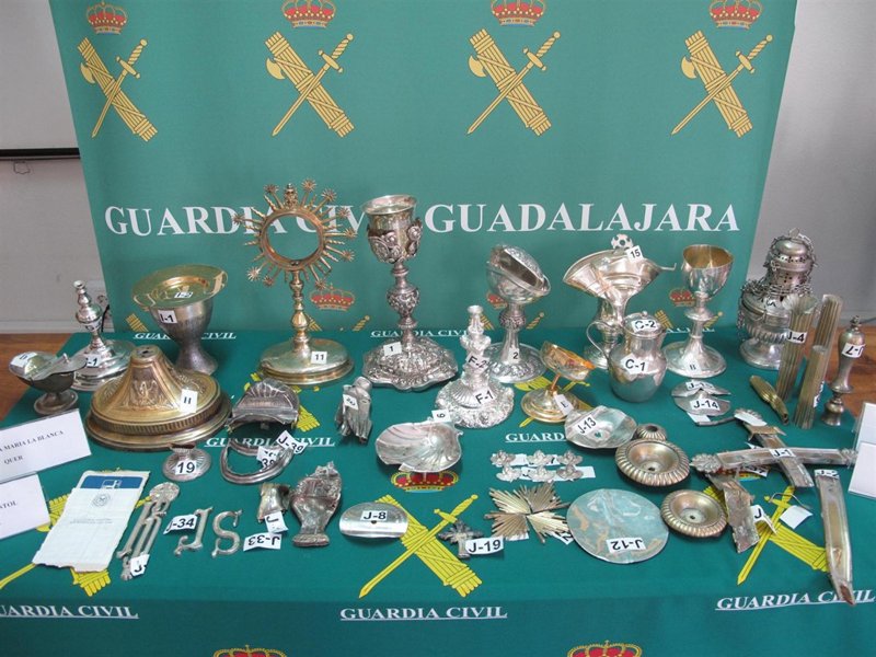 La Guardia Civil de la Comandancia de Guadalajara, en el marco de la Operación 'Ostensorio', ha detenido en la localidad de Yunquera de Henares (Guadalajara), a tres personas, identificadas como L.V.O, G.F, y S.C.G, de nacionalidad rumana y con edades comprendidas entre los 19 y los 26 años, como presuntas autoras de 16 delitos de robo con fuerza y de vehículos, y ha recuperado numerosos objetos religiosos que estas personas habían sustraído de las Iglesias de Quer, Miralrío, Loranca de Tajuña y Yunquera de Henares.