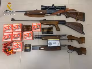 Tras la entrada y registro, autorizada por la autoridad judicial y efectuada en el domicilio del autor, se han localidado, además de diversos objetos sustraídos, cuatro armas de fuego, siendo estas un rifle, dos escopetas y una carabina de aire comprimido.