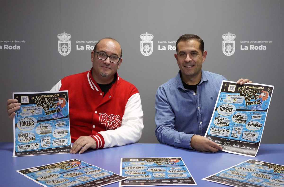 El concejal de Cultura de La Roda, Luis Fernández, acompañado por José Adrián Serrano, promotor y director del Doo Wop Fever, han presentado esta mañana todos los detalles de la nueva edición de 2024 que llega a su sexta edición "por todo lo alto" y con un cartel de "auténtico lujo".