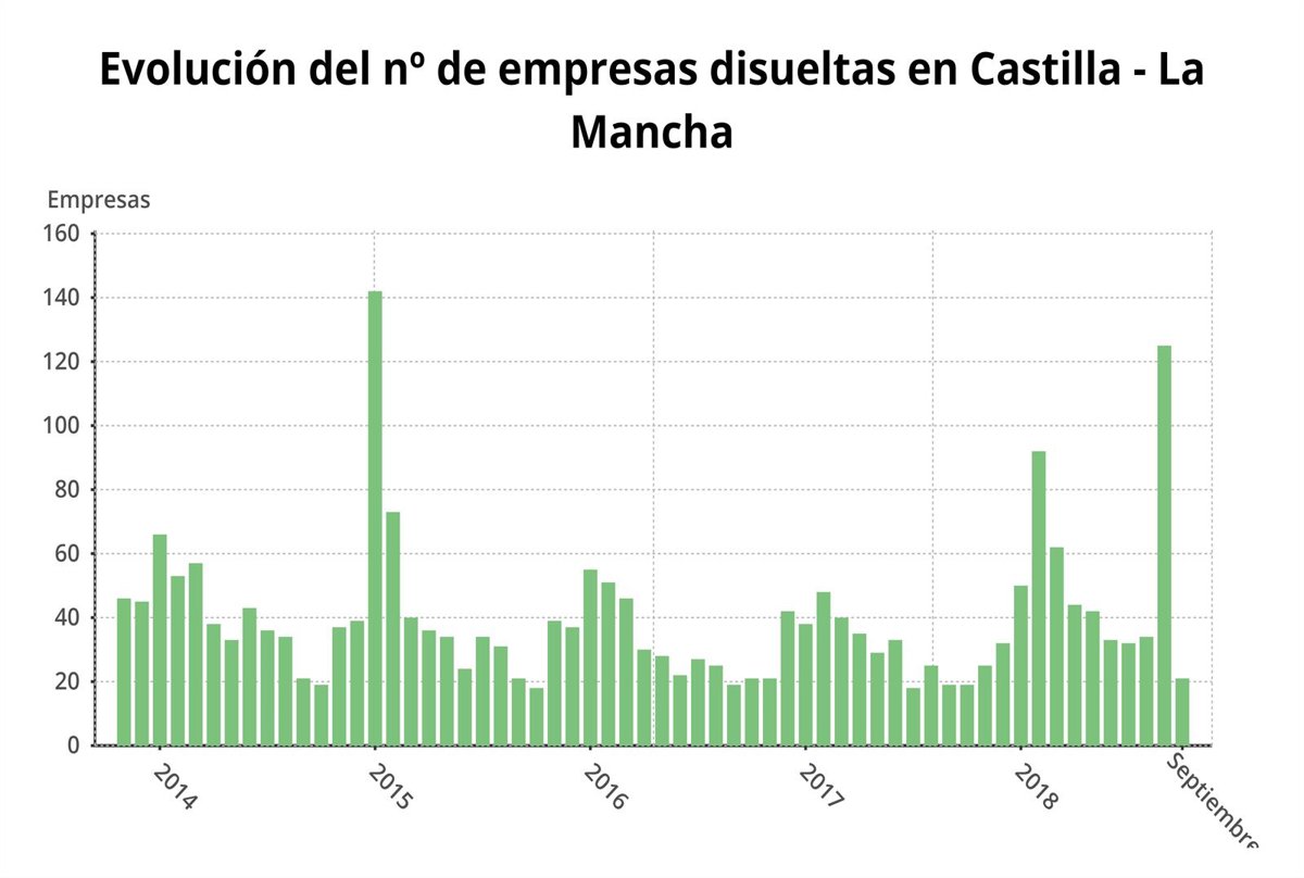 El número de nuevas sociedades mercantiles creció en Castilla-La Mancha un 3,7% en septiembre respecto al mismo mes de 2017, hasta sumar 169 empresas, al tiempo que las disoluciones empresariales se dispararon un 10,5 hasta totalizar 21, según los datos difundidos este jueves por el Instituto Nacional de Estadística (INE).