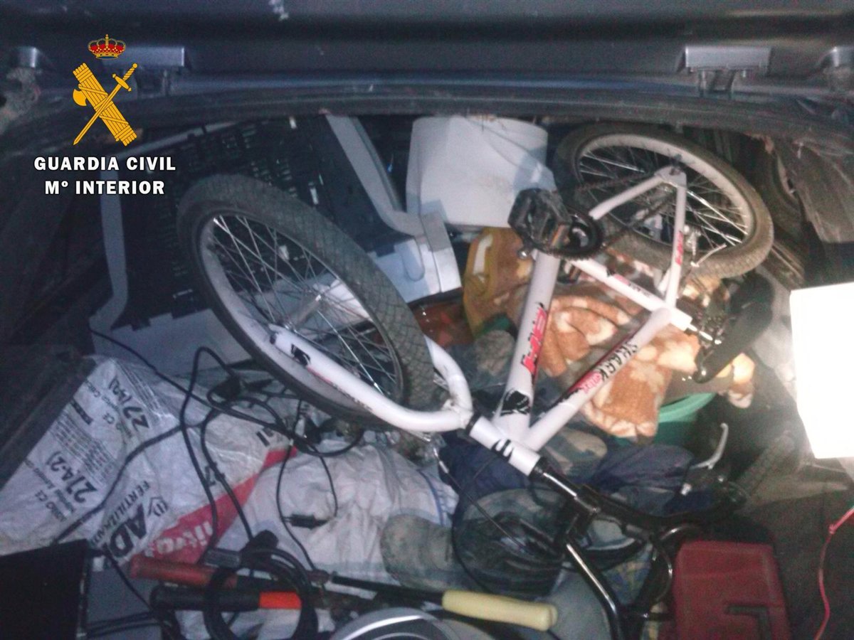La Guardia Civil inspeccionó el interior del vehículo y descubrió numerosos objetos, tales como candelabros, un televisor, un radio CD, un TDT, una cubertería, una bicicleta y un saco de cebollas, cuya procedencia y propiedad no pudieron acreditar sus ocupantes.