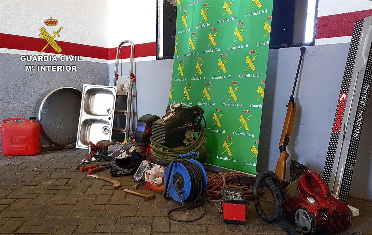 El material intervenido a los detenidos son una soldadora, una motosierra, un compresor, una radial, una careta para soldar, una garrafa de 25 litros de gasolina, seis baterías, dos taladros, un cargador de baterías, una caja de herramientas, una alargadera de cable, y un rollo de cable.