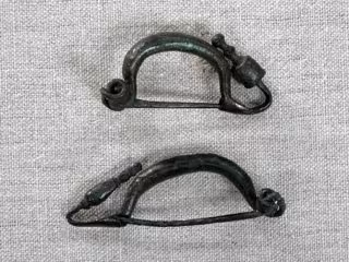 Se caracterizan por presentar resorte de muelle, arco curvado con decoración incisa y pie vuelto con remate abellotado y se pueden observar claramente las partes que la componen como la aguja, cabecera, puente y pie.