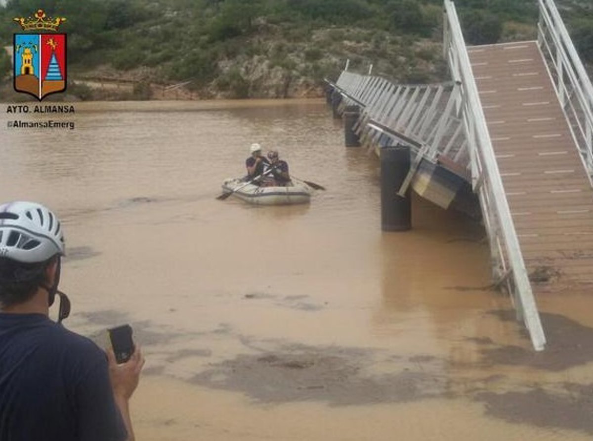 El equipo de buceo del Servicio Provincial de Incendios de la Diputación de Albacete se encuentra trabajando para intentar asegurar la pasarela que cruza el pantano de Almansa tras las inundaciones registradas en las últimas horas.