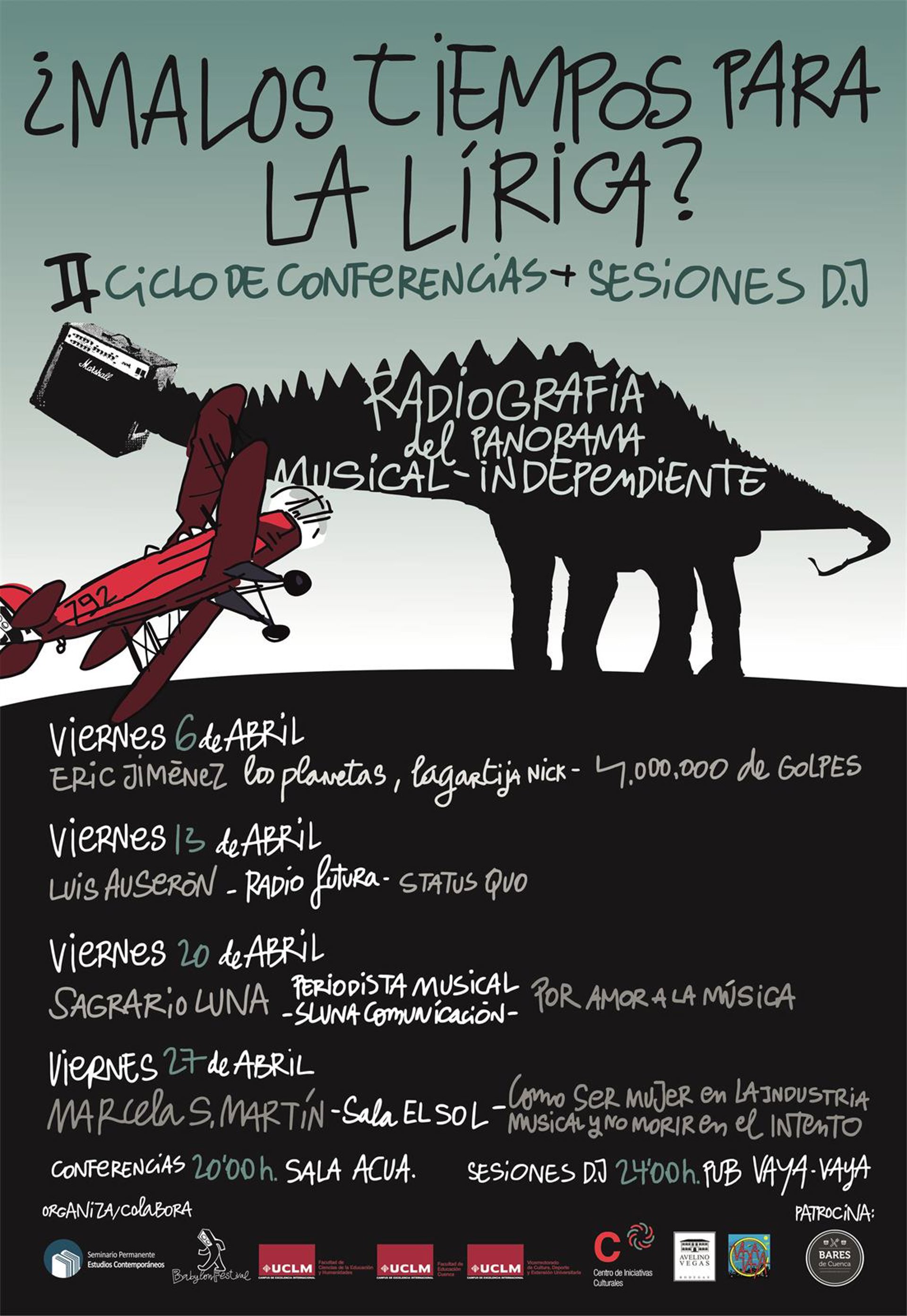 Prestigiosos profesionales del ámbito de la música actual, entre los que se encuentran Eric Jiménez y Luis Auserón, participarán desde este viernes, 6 de abril, en Cuenca en el II Ciclo de Conferencias-Sesiones DJ '¿Malos tiempos para la lírica? Radiografía del panorama musical independiente', analizando desde su experiencia la actividad musical desde diferentes perspectivas como la creación, la producción, la organización de eventos o el periodismo musical.