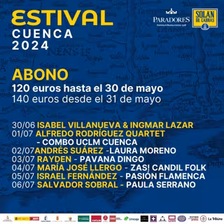 Con este abono se podrá disfrutar de los conciertos del domingo, 30 de junio, Estival Clásico, en el Patio de la Limosna del Claustro de la Catedral de Cuenca, con Isabel Villanueva&Ingmar Lazar (Navarra-Francia); y del lunes, 1 de julio, Estival Jazz, en el sscenario Solán de Cabras del Parador , con Alfredo Rodríguez Quartet (Cuba-Guinea Bissao)&Combo UCLM Cuenca.
