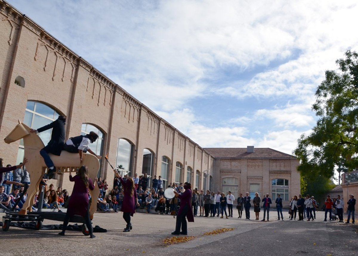 Para presentar este caballo recreado por los estudiantes de Arquitectura de la Universidad regional, se ha llevado a cabo la representación de un pasaje de la obra de Cervantes a cargo del grupo de teatro universitario 'Malaestirpe'.