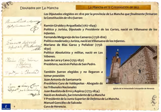 Comisariada por Enrique Jiménez, La Mancha en la Constitución de 1812 pretende rendir tributo a la contribución, tanto de políticos manchegos como de instituciones políticas de La Mancha del siglo XIX, a que la Carta Magna de 1812 resultase válida y provechosa para el país.