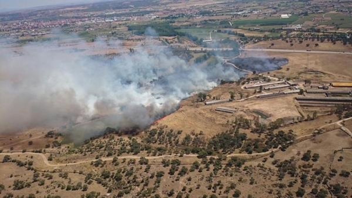 Todo parece indicar que el fuego se ha originado en uno de los establos de la finca, y ha llegado con fuerza hasta Santa Apolonia, y muy cerca de la Autovía A-5 de Extremadura.