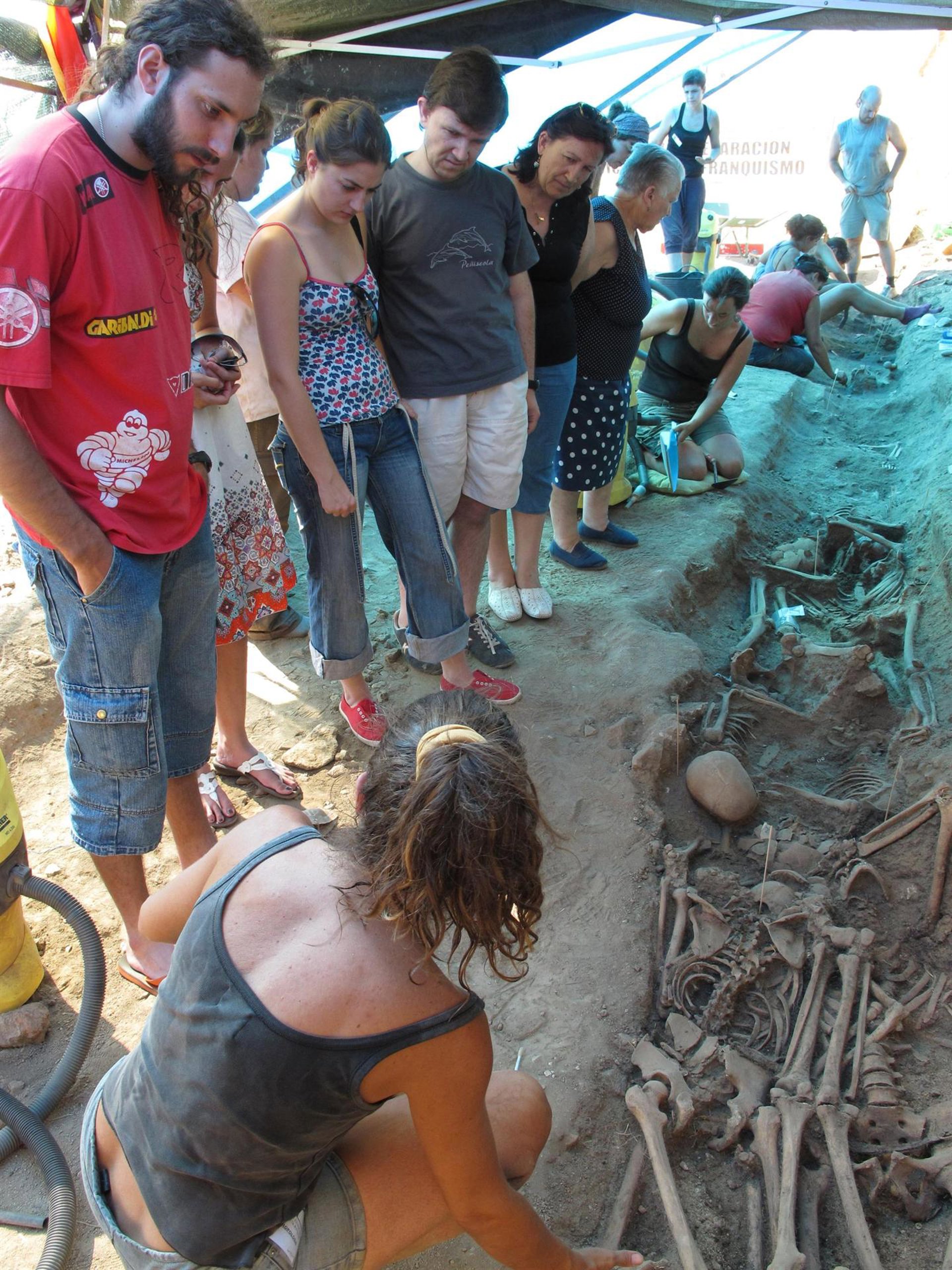 Se han abierto dos turnos de visitas a la fosa de 11.30 a 12.00 y de 17.30 a 18.00 horas y cada vez son más numerosos los grupos de personas que se acercan, entre ellos cabe destacar un grupo de niños que guiados por su monitor y una antropóloga han recibido información y explicaciones.
