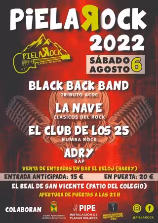 La tercera edición del Festival PielaRock de la localidad toledana de El Real de San Vicente homenajeará a las leyendas del rock AC/DC este sábado, 6 de agosto. El cartel está formado por Black Back Band, que darán buena cuenta de todos los éxitos de la banda de Angus Young, el rapero local Adry, la rumba fusión de El Club de los 25 y los himnos del pop rock de la década de los 80 de la Nave Rock.