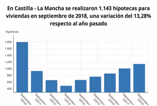 El número de hipotecas constituidas sobre viviendas inscritas en los registros de la propiedad de Castilla-La Mancha se situó en 1.143 el pasado mes de septiembre, cifra un 13,28% superior a la del mismo mes de 2017, según ha informado este viernes el Instituto Nacional de Estadística (INE). Con respecto al mes anterior se han incrementado un 9,2 por ciento.