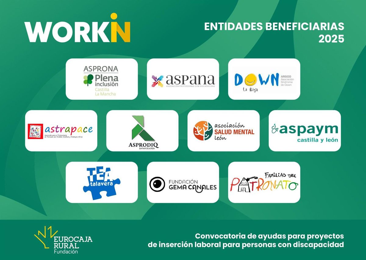 La Fundación Eurocaja Rural ha seleccionado las 10 entidades beneficiarias de sus ayudas 'Workin' para impulsar la inserción laboral de personas con discapacidad. Cada uno de los diez proyectos seleccionados recibirá una ayuda de 10.000 euros.