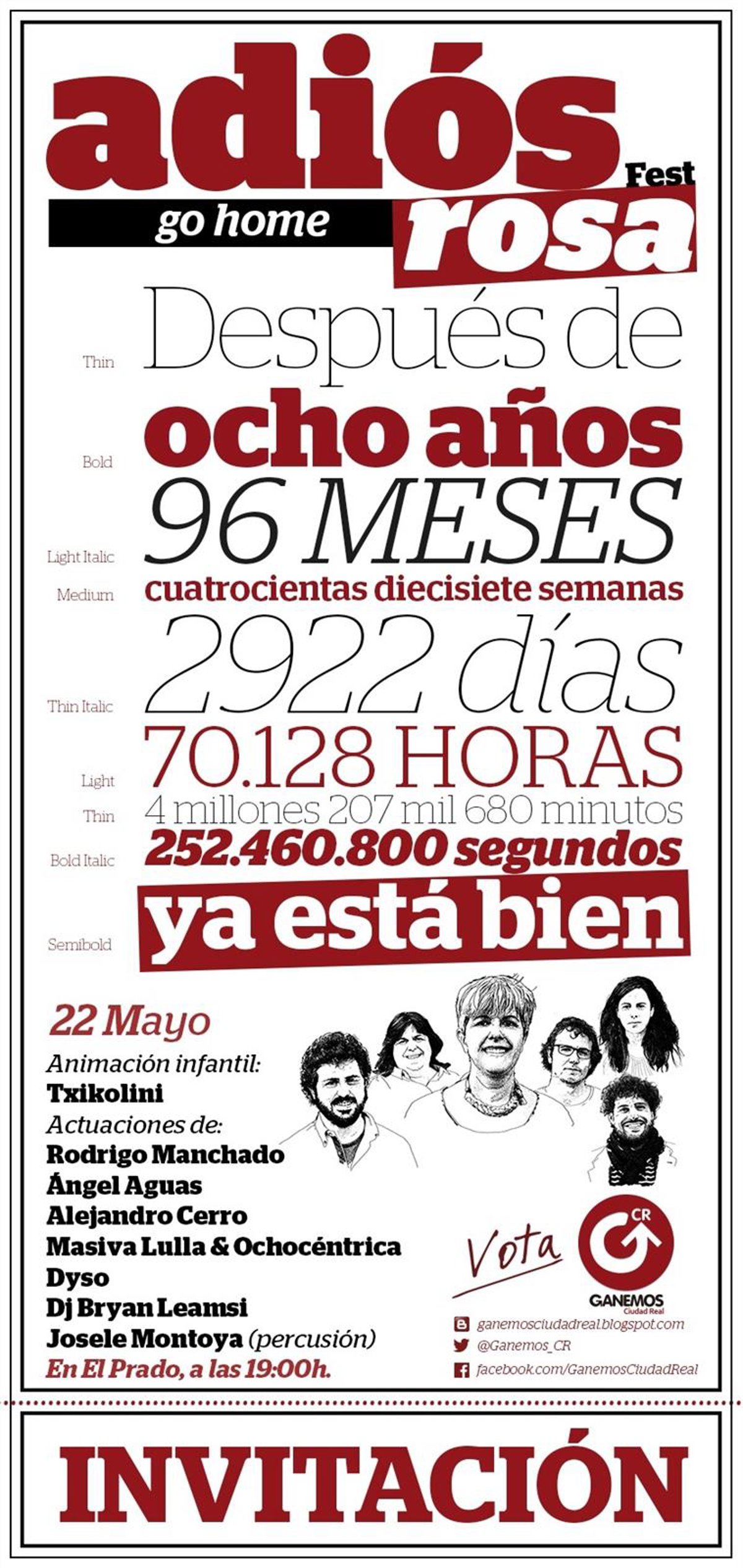 Ganemos Ciudad Real tiene previsto celebrar una fiesta de fin de campaña que tendrá lugar mañana a partir de las 19.00 horas en los Jardines del Prado, cuyo cartel reza 'Adiós Rosa. Go Home', en referencia a la candidata del PP a revalidar la Alcaldía, Rosa Romero.