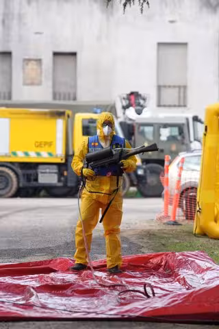 Un miembro de la UME desinfectan vehiculos, durante la presentación de los medios de la UME para el control de la peste porcina, a 2 de diciembre de 2025, en Barcelona, Cataluña (España). - David Zorrakino - Europa Press