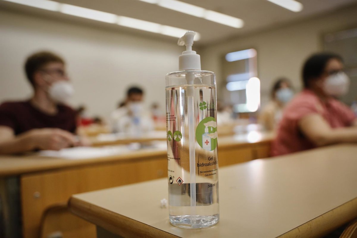Gel desinfectante en un pupitre - Jesús Hellín - Europa Press - Archivo