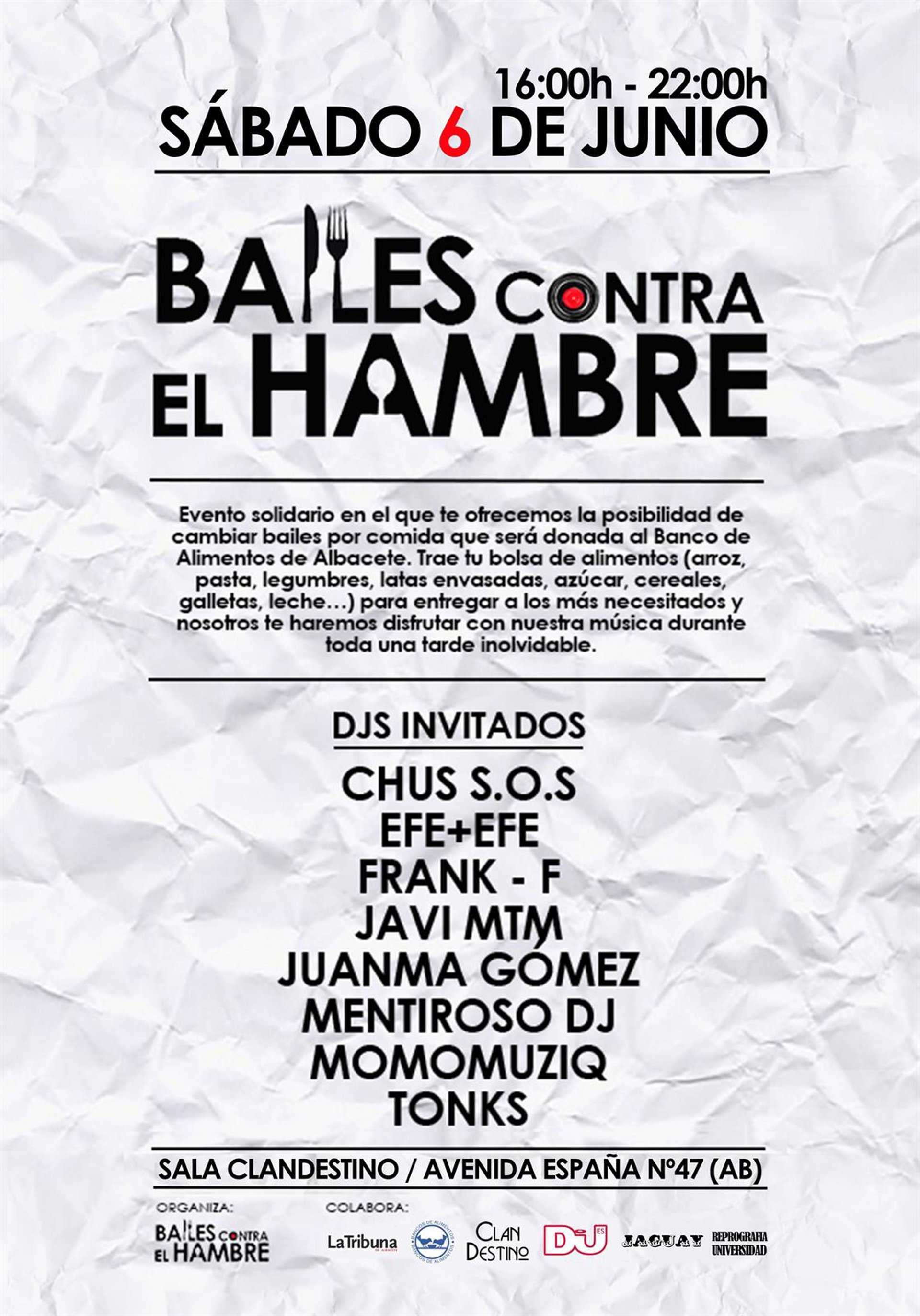 Para esta primera edición de 'Bailes contra el Hambre' colaboran Frank-f, Javi MTM, Juanma Gómez, Mentiroso dj, Momomuziq, Tonks, Chus SOS y a efe+efe. También colaboradores oficiales como Rafa Zapata de Microart, DJMAG ES, Reprografía Universidad, Jaguay, Chapitas Albacete y La Tribuna de Albacete.
