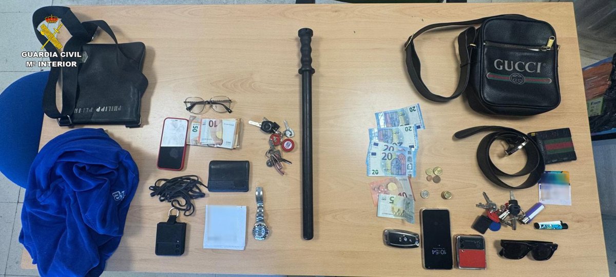 Como resultado del registro practicado en el turismo, se localizó una defensa semirrígida (similar a las utilizadas por la Fuerzas y Cuerpos de Seguridad del Estado) con la que habrían golpeado a la víctima, así como más de 2.000 euros en efectivo, teléfonos móviles y otros efectos.