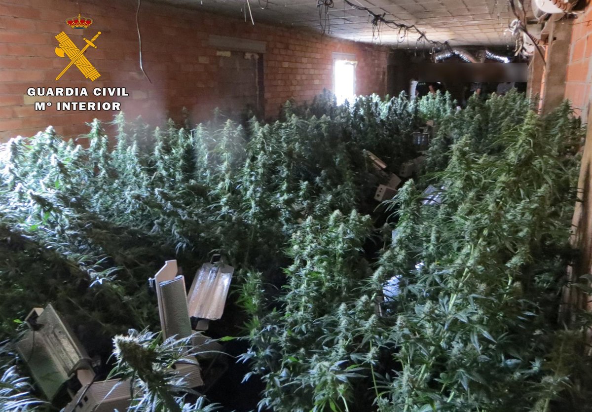 Tras la detención de estas personas, la incautación de la sustancia vegetal y con las pruebas recabadas con anterioridad, la Guardia Civil ha realizado un registro en el lugar donde se encontraría el centro de cultivo indoor, donde se incautaron 1.544 plantas de cannabis sativa en diferentes fases de crecimiento y que arrojaron un peso de 383 kilos, 6.950 gramos de cogollos secos de esta sustancia, 1.360 euros, cuatro cuadros eléctricos, 94 transformadores eléctricos, 94 lámparas caloríficas, 13 equipos completos de aire acondicionado, 6 extractores de aire, 6 filtros de carbón activo, dos bombas extractoras de líquidos, cinco depósitos de líquidos, 2.445 macetas de plástico, 33 sacos de fertilizante y varios envases para el crecimiento y nutrición de las plantas.