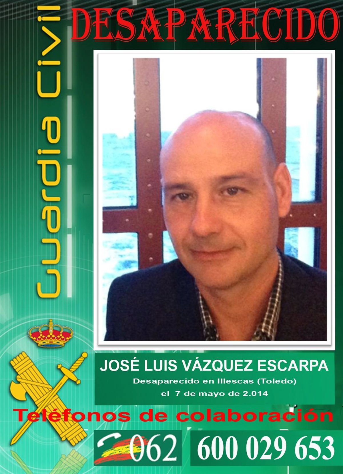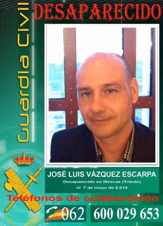 La Guardia Civil solicita colaboración ciudadana para localizar a José Luis Vázquez Escarpa, empresario, de 50 años, que desapareció en extrañas circunstancias en Illescas (Toledo) el 7 de mayo de 2014, aunque residente en Madrid capital, su trabajo lo desarrollaba en localidades del sur de la Comunidad madrileña y la provincia de Toledo.