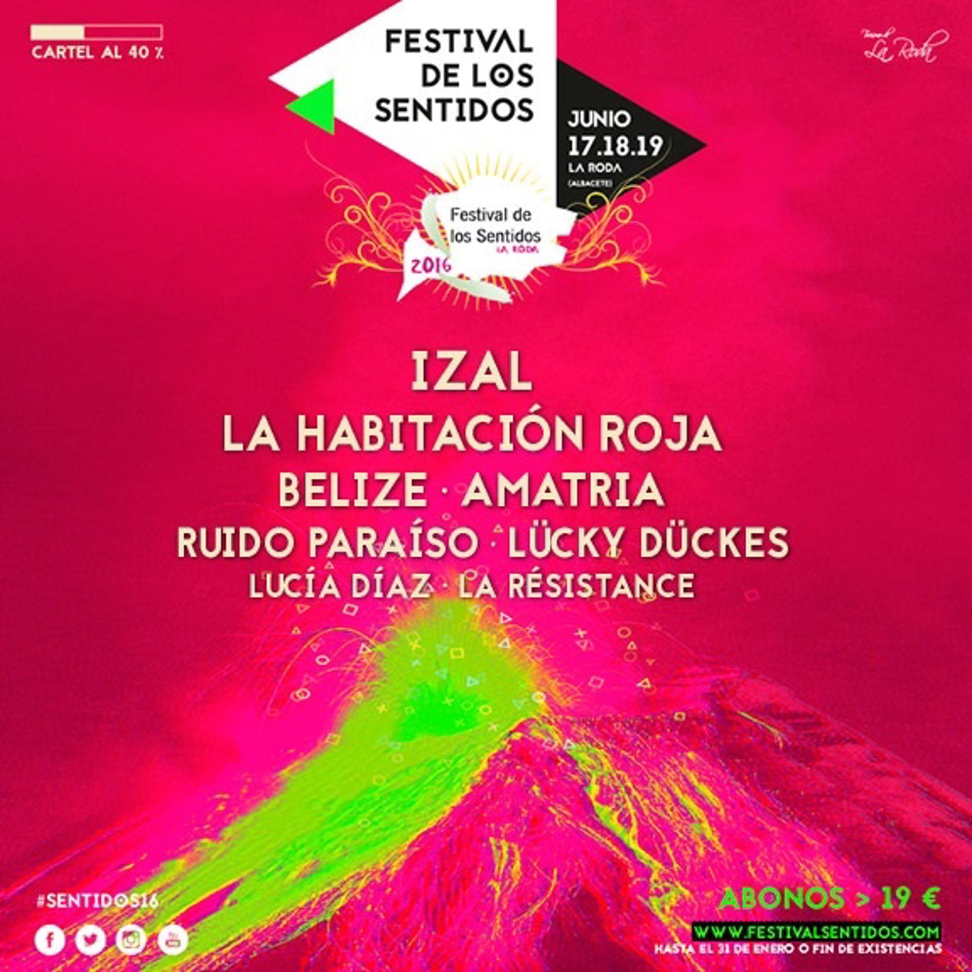 Los grupos La Habitación Roja, Belize, Amatria, Ruido Paraíso, Lücky Dückes y Lucía Díaz y La Resistance se han sumado al Festival de los Sentidos de La Roda, que se celebrará los próximos 17, 18 y 19 de junio en esta localidad albaceteña.