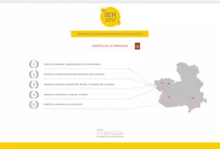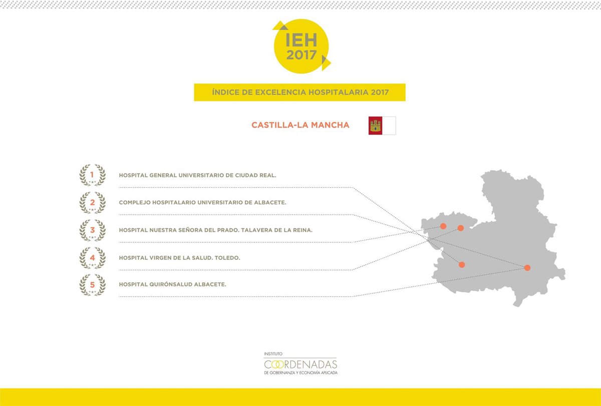 Cierran el top 5 del IEH 2017 autonómico el Hospital Virgen de la Salud de Toledo, que este año cae de la primera a la cuarta posición, y el Hospital Quirónsalud Albacete, en quinto lugar, según ha informado el Instituto en un comunicado.
