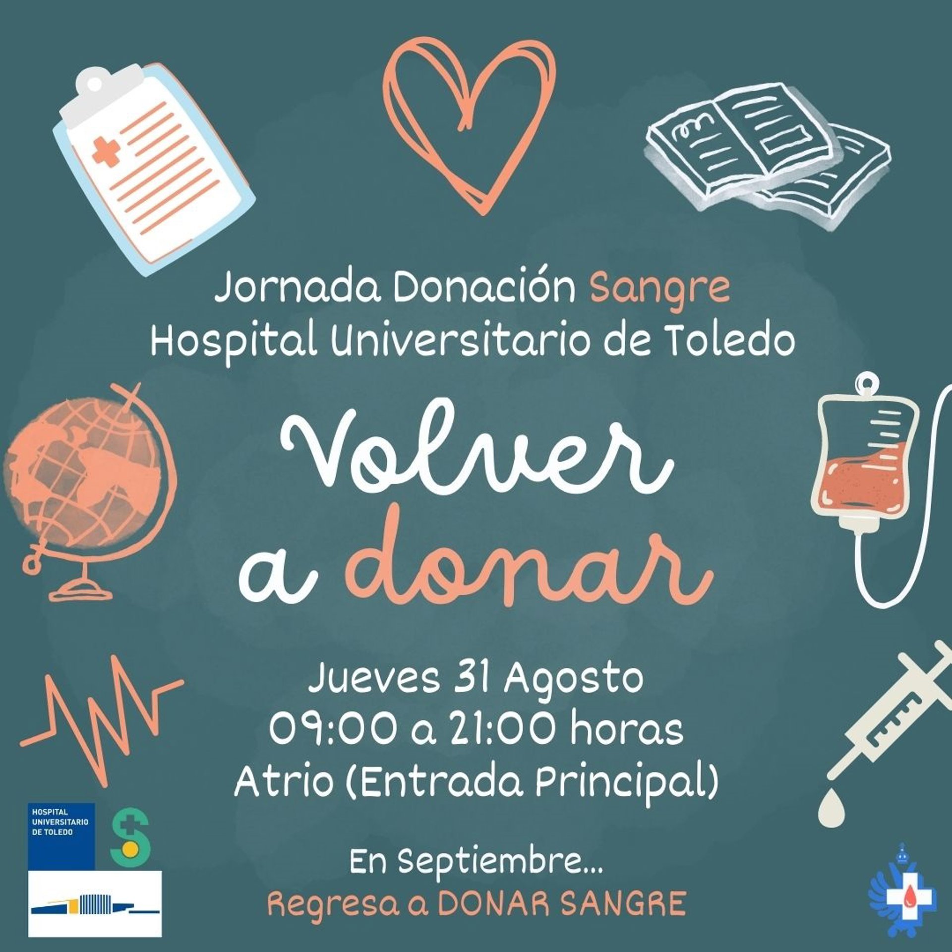La Hermanad de Donantes de Sangre de Toledo ha lanzado una nueva campaña de donación, que bajo el lema 'Volver a donar', va a tener lugar este jueves, 31 de agosto, de 9.00 a 21.00 horas en la entrada principal del Hospital Universitario de Toledo.