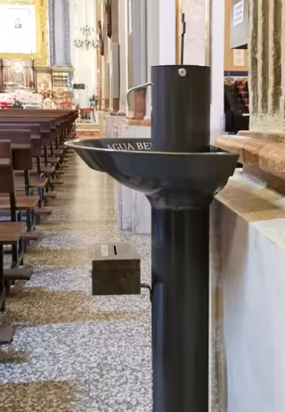 Gracias a este dispensador, instalado por la empresa AquaSanctus, cada fiel recibe directamente en sus manos el agua bendita necesaria para santiguarse sin necesidad de que su piel entre en contacto con ninguna superficie, minimizando así el riesgo de contagio.