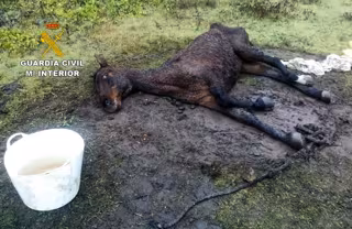 El equino presentaba síntomas de extrema delgadez, así como convulsiones periódicas, comprobando los efectivos del SEPRONA como el animal se orinaba encima encontrándose envuelto en sus propias heces.