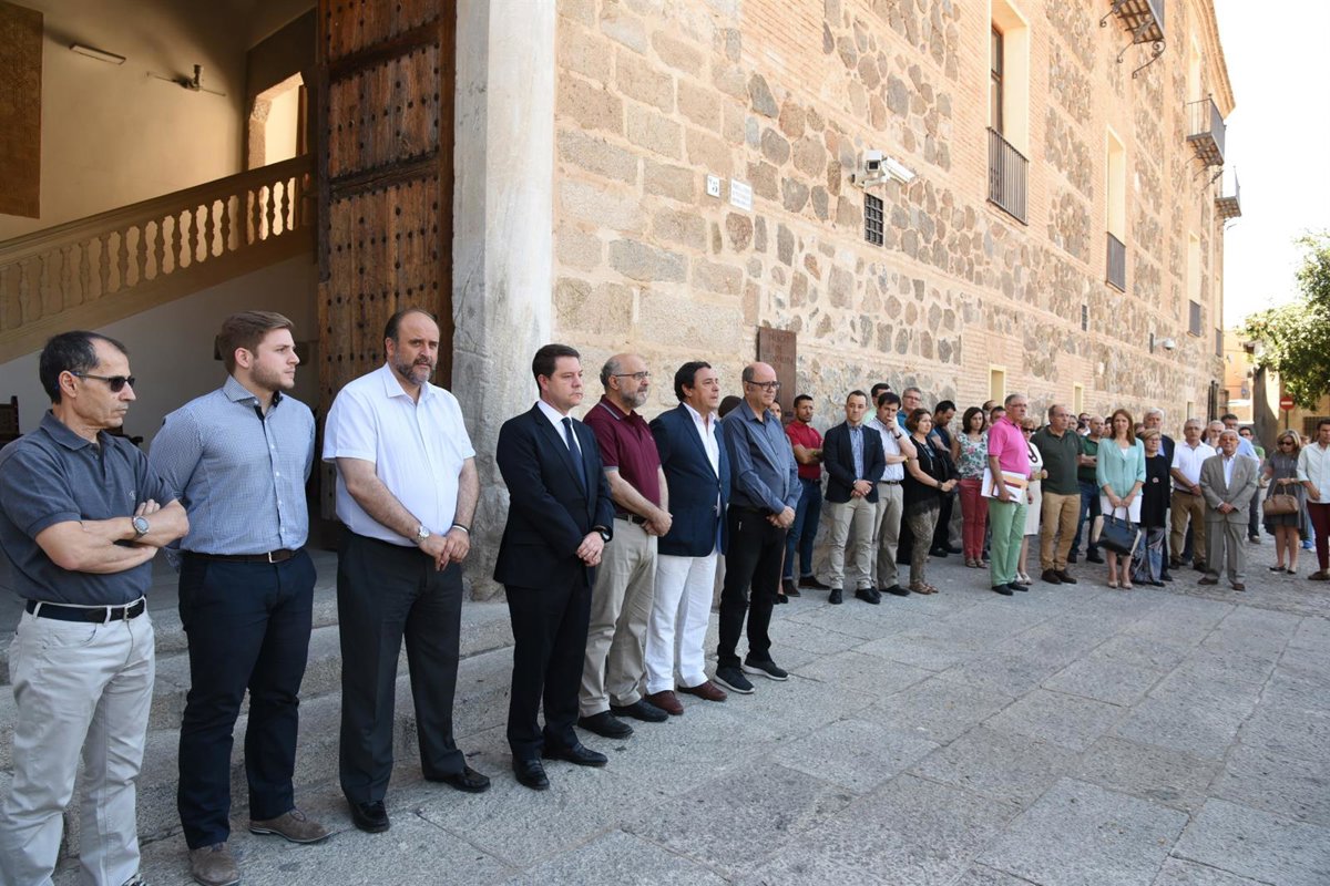 Miembros del Gobierno regional, encabezados por su presidente, Emiliano García-Page; su vicepresidente, José Luis Martínez Guijarro; y su portavoz, Nacho Hernando, han guardado un minuto de silencio junto con varias decenas de personas a las puertas del Palacio de Fuensalida, en Toledo.