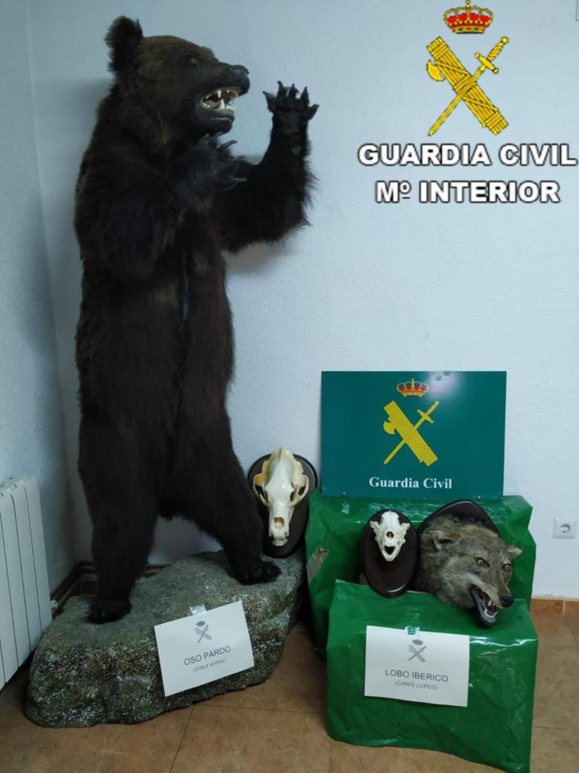 Los agentes, según ha informado en nota de prensa el Instituto Armado, se pusieron en contacto con esta persona y, tras acceder voluntariamente a mostrar los ejemplares en su vivienda, se encontraron, entre otros especímenes cinegéticos, un cuerpo entero de oso pardo y una cabeza de lobo ibérico, ambos naturalizados, junto a sus cráneos de forma separada.