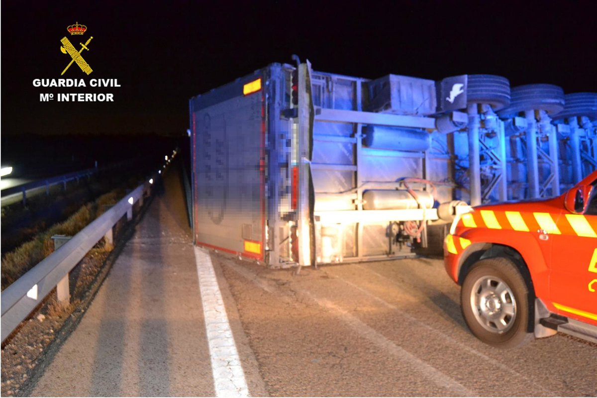 A la llegada de las patrullas de Tráfico se encontraron un aparatoso accidente entre un turismo y un camión articulado que había volcado en la calzada, quedando ésta, totalmente cortada al paso de los vehículos sentido Madrid, ha informado la Guardia Civil en nota de prensa.