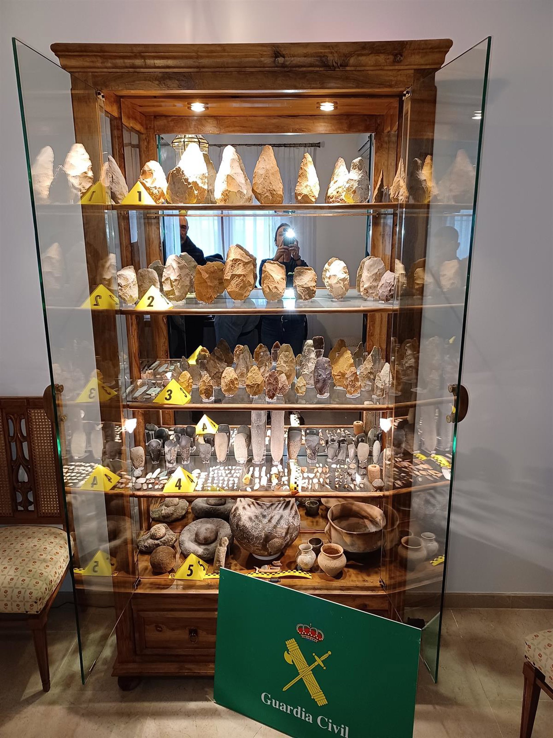 Entre las piezas incautadas hay elementos líticos, que son los mayoritarios en la colección, entre los que se encuentran núcleos o grandes hojas/raspadoras, bifaces lanceolados, lascas y hojas de corte, y, grandes puntas, que aparentemente pertenecían al Paleolítico. Otras puntas de flechas, microlítos y hojas de corte y molinos de mano, podían pertenecer al Calcolítico. Mientras que las hachas y cinceles pulimentados se encuadrarían en el Neolítico y Edad de Cobre.