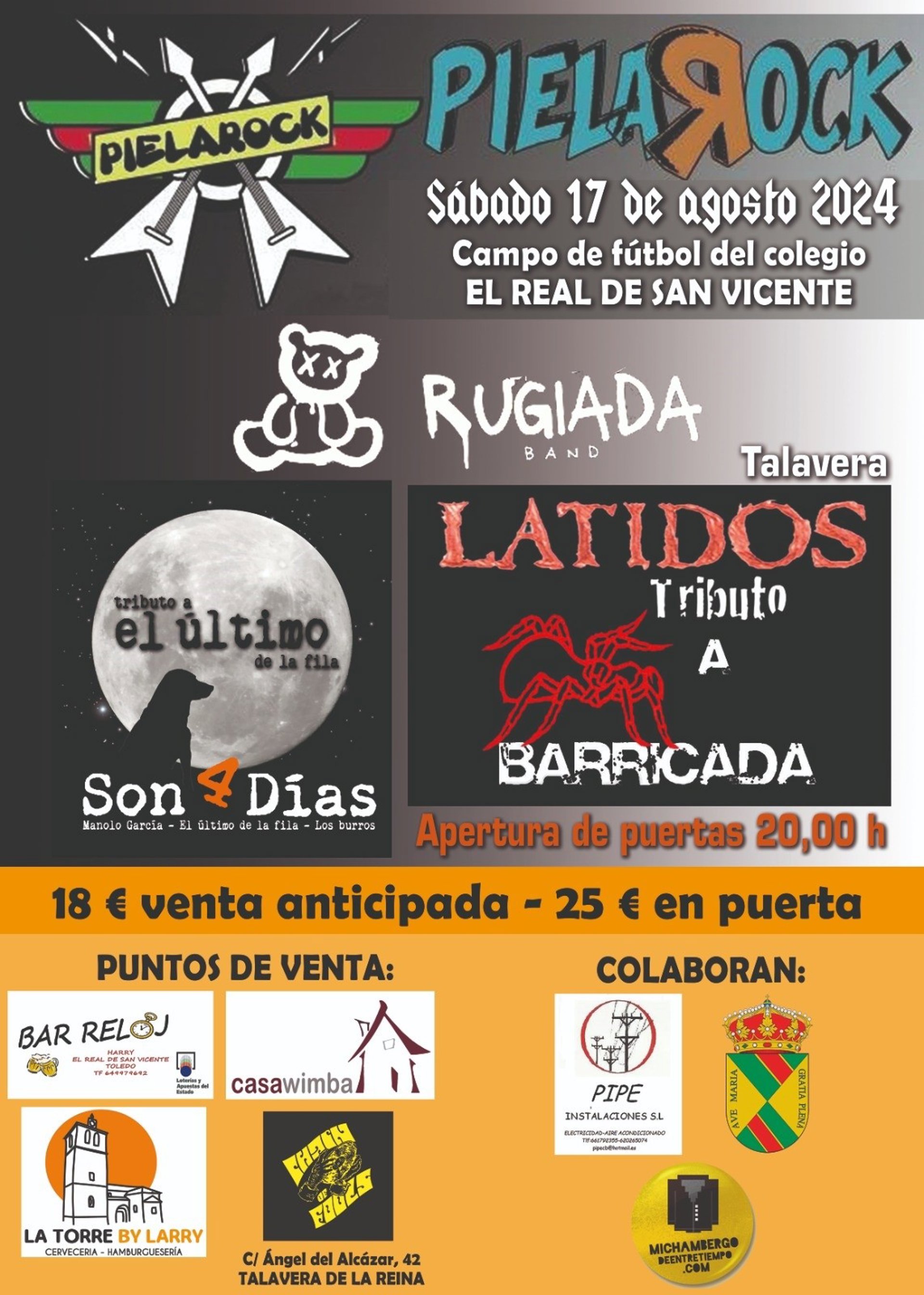 La cuarta edición de PielaRock cuenta con la colaboración del Ayuntamiento de El Real de San Vicente, Pipe Instalaciones SL, Mi Chambergo de Entretiempo, Casa Wimba, La Torre by Larry, Bar Reloj Harry y Chain of Fools.