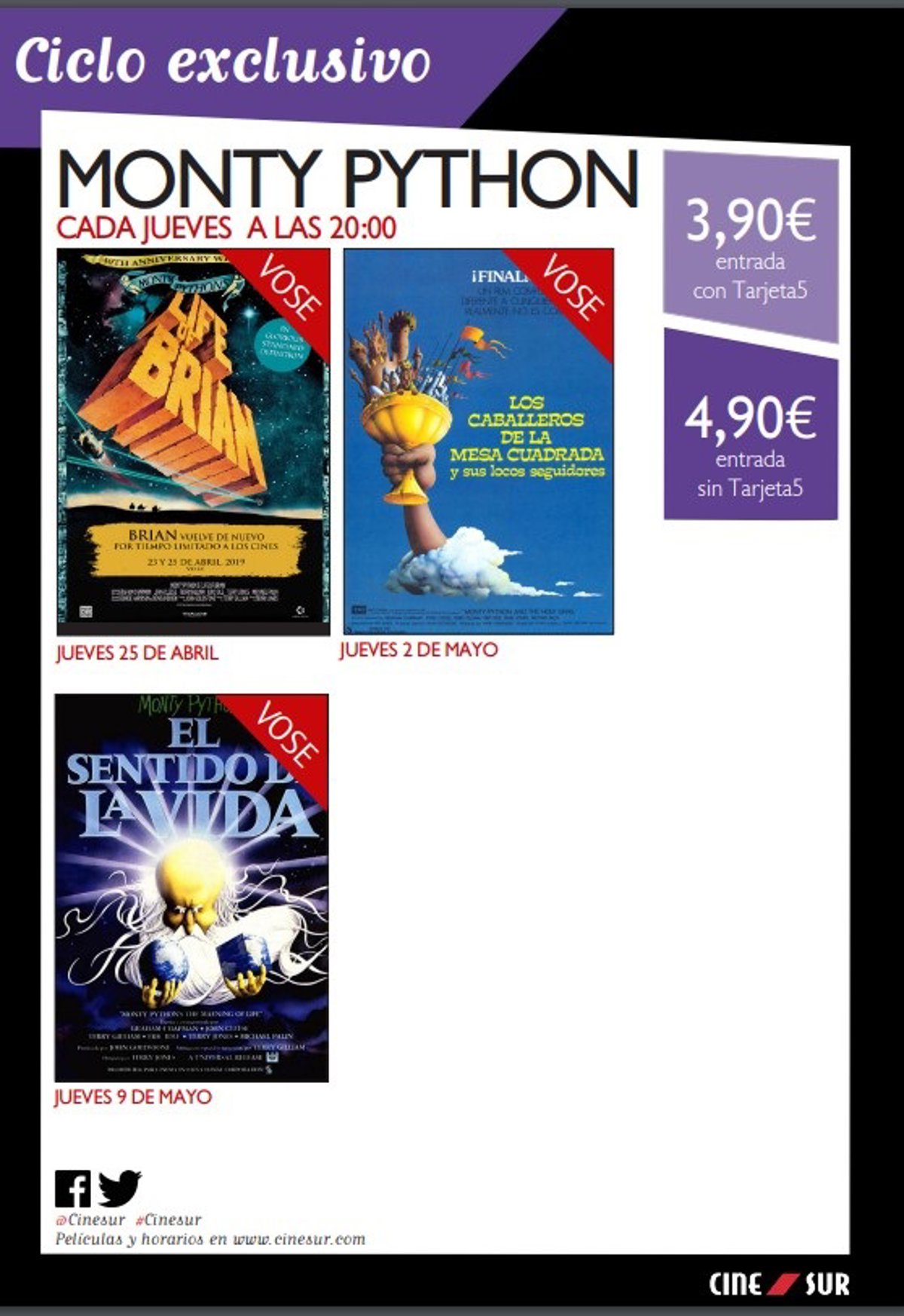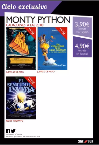 El jueves 25 de abril arrancará con 'La vida de Brian', le seguirá 'Los caballeros de la mesa cuadrada y sus locos seguidores' el 4 de mayo y terminará con 'El Sentido de la Vida' el jueves 5 de mayo, según la programación, recogida por Europa Press.
