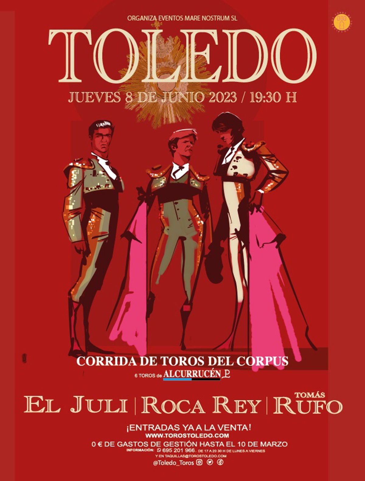 Julián López 'El Juli', que vuelve a Toledo y al Corpus para celebrar sus 25 años de alternativa, cita imprescindible en una plaza y una fecha donde ha cosechado grandes triunfos y a la que no podía faltar en un año tan especial; Andrés Roca Rey como máxima figura indiscutible mundial y Tomás Rufo en su tierra defendiendo su puesto de nueva figura del toreo componen el cartel de la corrida que el 8 de junio acogerá la capital regional a las 19.30 horas.