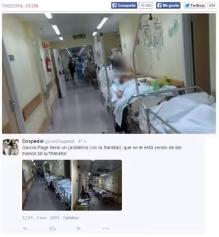 Explican en la nota de prensa que a las 12.43 horas, el perfil @conCospedal en Twitter publicaba dos fotos con pacientes en los pasillos de las Urgencias del hospital toledano acompañadas por el texto 'García-Page tiene un problema con la Sanidad, que se le está yendo de las manos'.