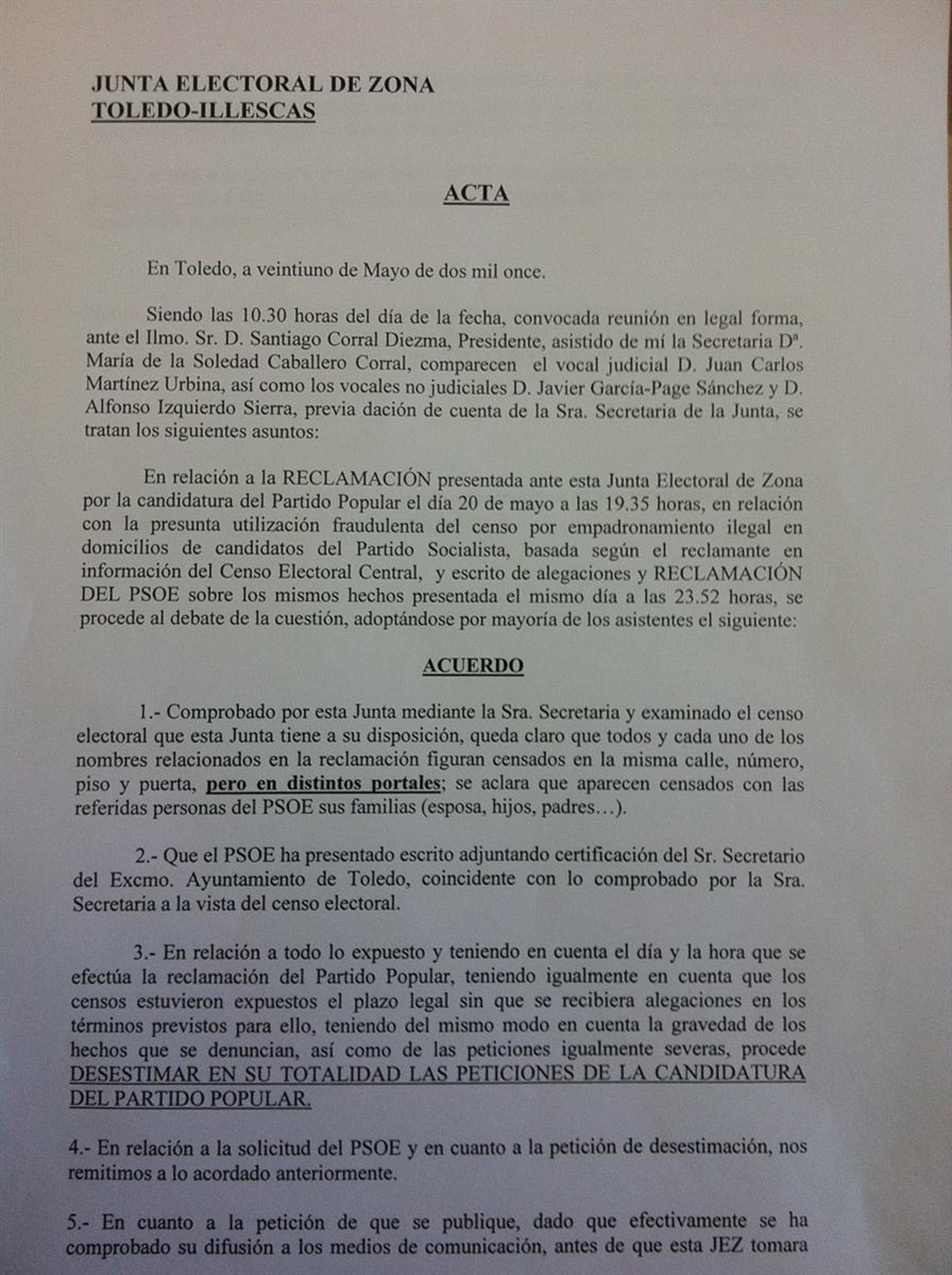 En su resolución, según ha informado el PSOE en nota de prensa, la Junta Electoral de Zona da la razón a la candidatura de Emiliano García-Page, que anoche mismo solicitó un certificado al secretario general del Ayuntamiento de Toledo para que quedaran claro que los empadronamientos de las personas apuntadas por el PP eran correctos y en ningún momento fraudulentos.