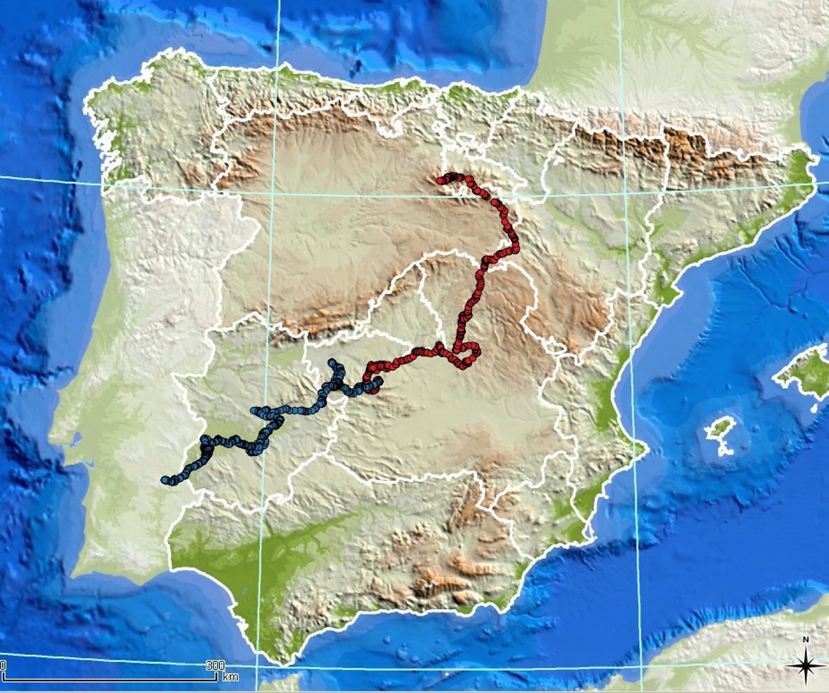 Durante su tránsito por esta comunidad, el macho ha sido capaz de cruzar a nado el río Guadiana para llegar a finales del mes de mayo a Portugal, habiendo cruzado recientemente el embalse de Alqueva,