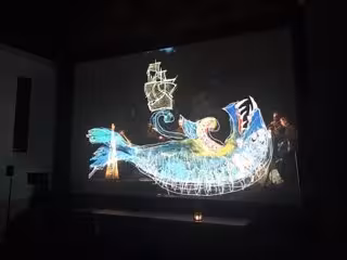 Al otro lado, se encuentran los músicos, posicionados como si fueran en la bodega del barco, y sus rostros aparecen y desaparecen tras los dibujos que van desarrollando una historia paralela, construida con imágenes de ensoñación.