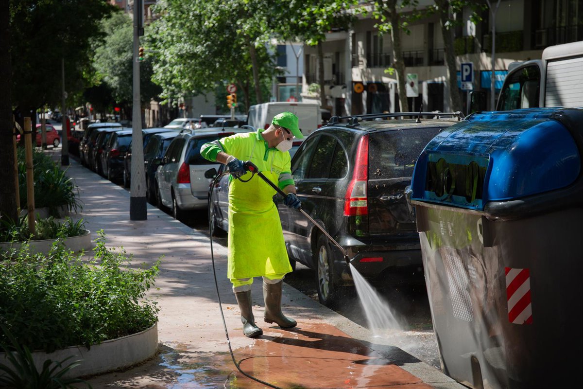 Un operario de limpieza del servicio municipal desinfecta un contenedor de basura - David Zorrakino - Europa Press - Archivo