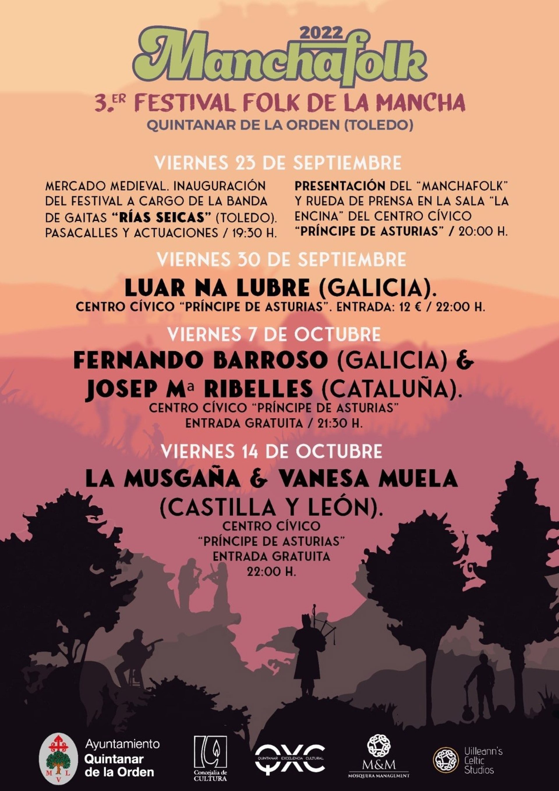 Luar na Lubre --que actuará el 30 de septiembre-- La Musgaña, Vanesa Muela, Fernando Barroso y Josep-María Ribelles conforman el elenco que podrán en escena la tercera edición del Manchafolk, el festival folk de La Mancha, que se celebra del 23 de septiembre al 14 de octubre en la localidad de Quintanar de la Orden.