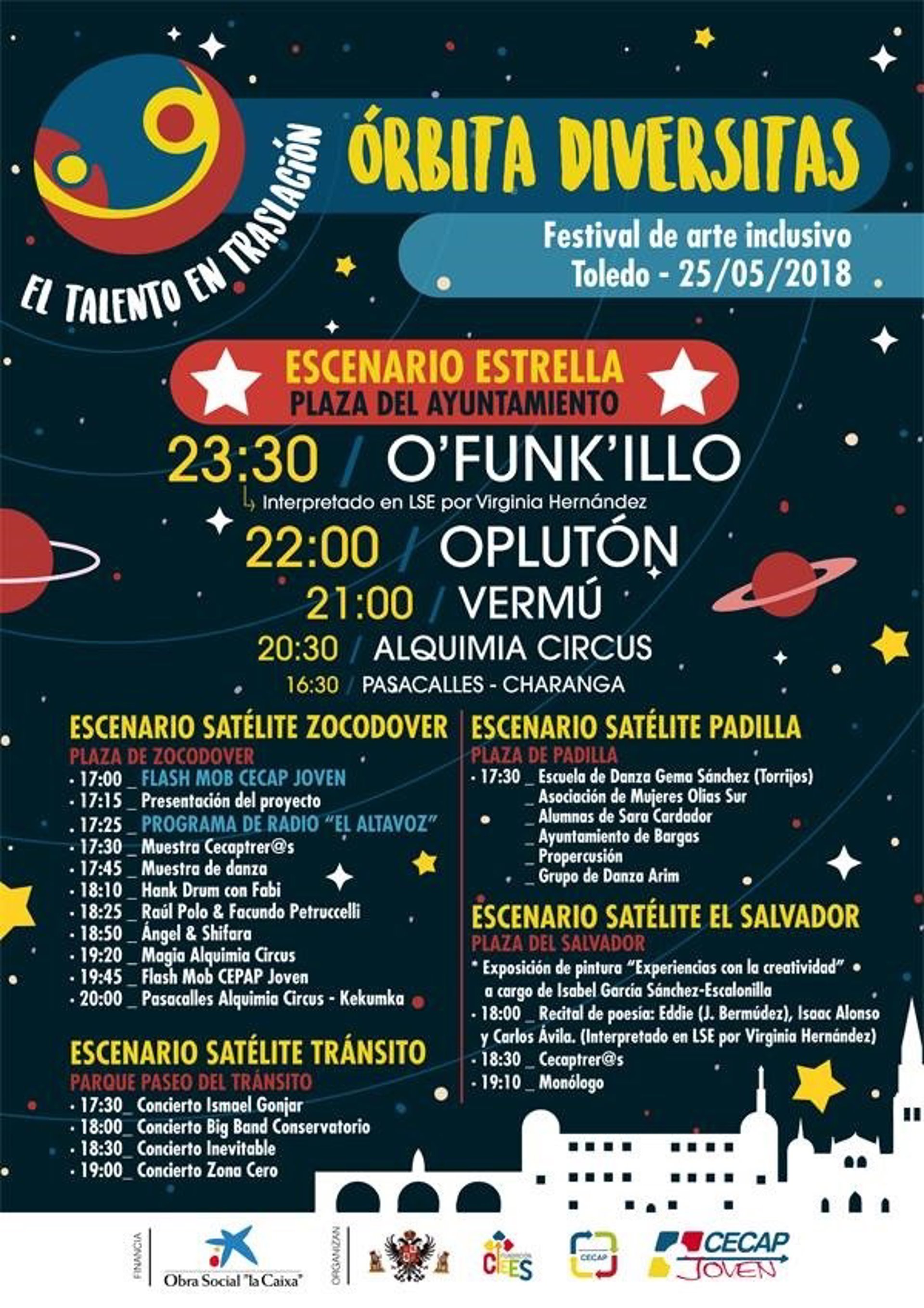 Martínez ha detallado que está edición de Diversitas Fest se va a desarrollar en cuatro plazas y un parque del Casco Histórico de Toledo. Una de ellas será la Plaza de Zocodover, donde se instalará el escenario 'Satélite' comenzarán a partir de las 17.00 horas las actividades con un 'flashmob'; a las 17.15 horas se presentará el proyecto Diversitas, a lo que seguirá la emisión en directo del programa de radio 'El Altavoz', de Onda Polígono.