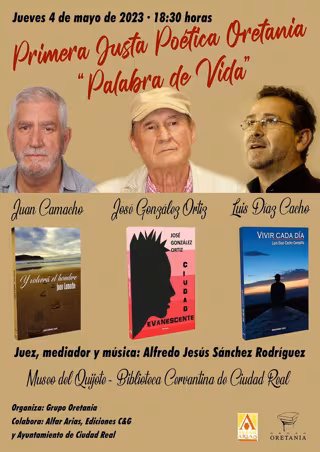 Un torneo muy singular tendrá lugar el jueves 4 de mayo, de 18.30 a 20.00 horas, en el Museo del Quijote-Biblioteca Cervantina de Ciudad Real. La 'I Justa Poética Oretania: Palabra de Vida', a cargo de los poetas Luis Díaz-Cacho, José González Ortiz y Juan Camacho, quienes defenderán sus creaciones.