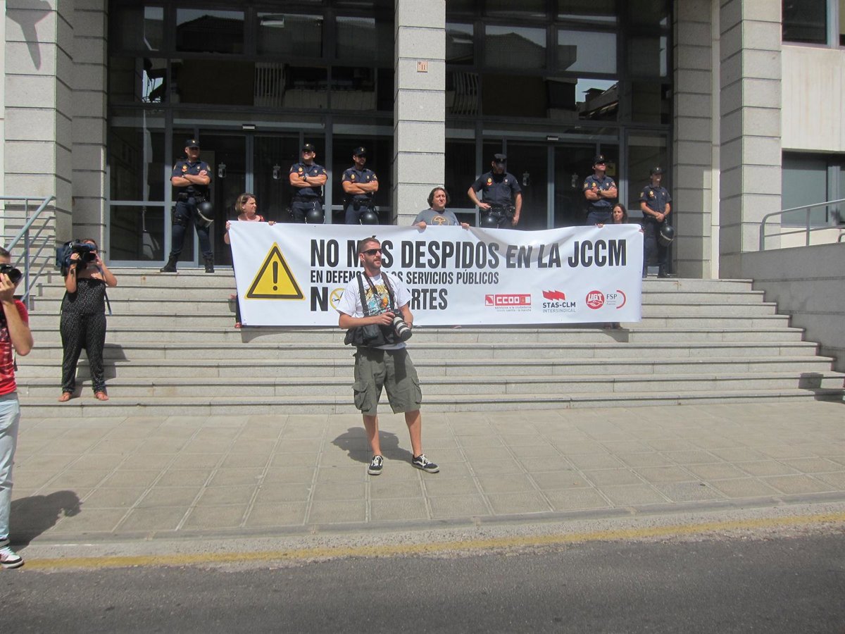 En la escalinata de acceso al edificio, cuya puerta está custodiada por agentes de la Policía Nacional, continúa una pancarta en la que se puede leer: 'No más despidos en la Junta. En defensa de los servicios públicos'. En estos momentos, los manifestantes han abandonado la acera de enfrente del edificio y están ocupando la escalinata. En principio, está previsto que la reunión termine sobre las 15.00 horas.