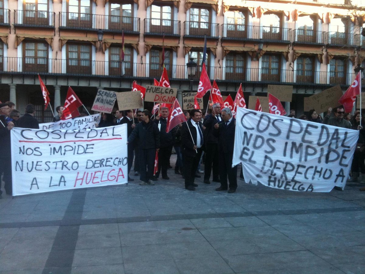 Con lemas como 'Cospedal nos impide nuestro derecho a la huelga', 'Servicios Mínimos Abusivos' o 'No se cobra en Rubicar' y haciendo sonar pitos y tambores, los trabajadores de ambas empresas, acompañados de algunos familiares, han partido de la plaza de Zocodover en torno a las 17.10 horas dirección a El Tránsito, después de que la subdelegación del Gobierno no autorizara el paso de la marcha por el Palacio de Fuensalida, sede del Gobierno regional.