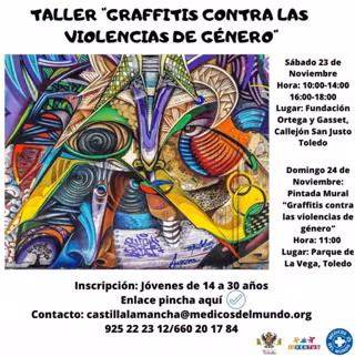 El sábado 23 de noviembre en los horarios de 10.00 a 14.00 y de 16.00 a 18.00 en la Fundación Ortega y Gasset de Toledo, se llevará a cabo el taller de iniciación al graffiti y la aproximación a diferentes formas de violencias de género.